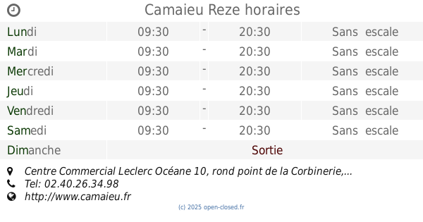 Please note that the information for Camaieu Dans Reze, Centre Commercial Leclerc Océane 10, rond point de la Corbinerie and all other Stores is for reference only.